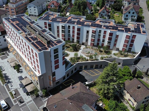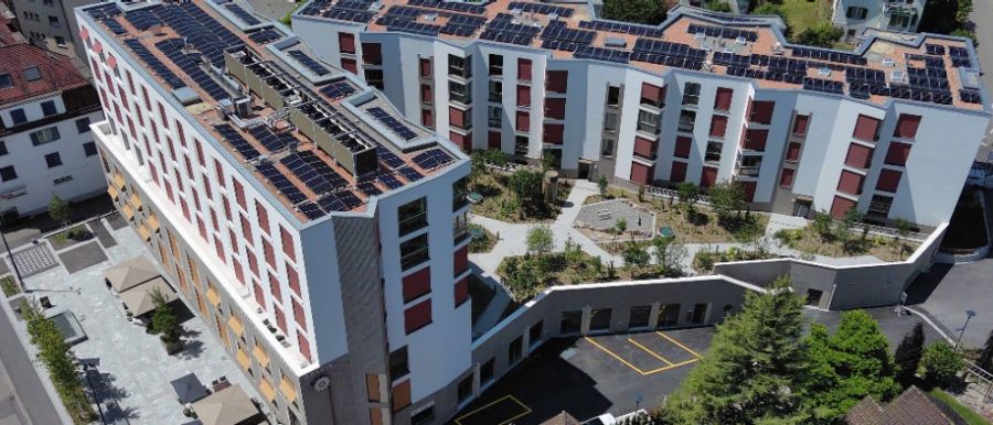 An elevated PV system with an output of 126 kilowatt peak supplies the two buildings (one seven-storey and one five-storey) with carbon-free solar power. The planners expect the system to produce around 124 megawatt-hours of electricity per year. To maximise on-site consumption of cheap solar power, the owners have joined a ZEV that is billed through ewz. The operation of connected consumers, such as heat pumps and charging stations for electromobility, is optimally coordinated with production from the PV system. The self-consumption rate is over 60 per cent, with the users drawing their remaining demand from the grid. On sunny days when the plant produces more electricity than users need on site, it is fed into the grid of the local energy supplier.